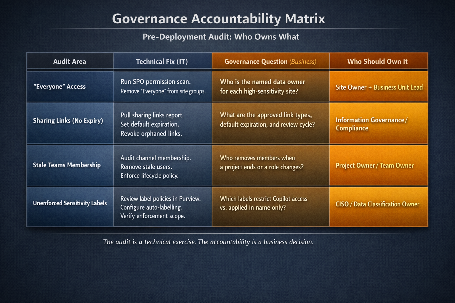 If your organization deploys Copilot without it, you’re not behind on permissions. You’re behind on accountability. And when something surfaces that shouldn’t, the question won’t be “why didn’t IT fix the permissions.” It will be “who signed off on deploying this before the governance work was done.”