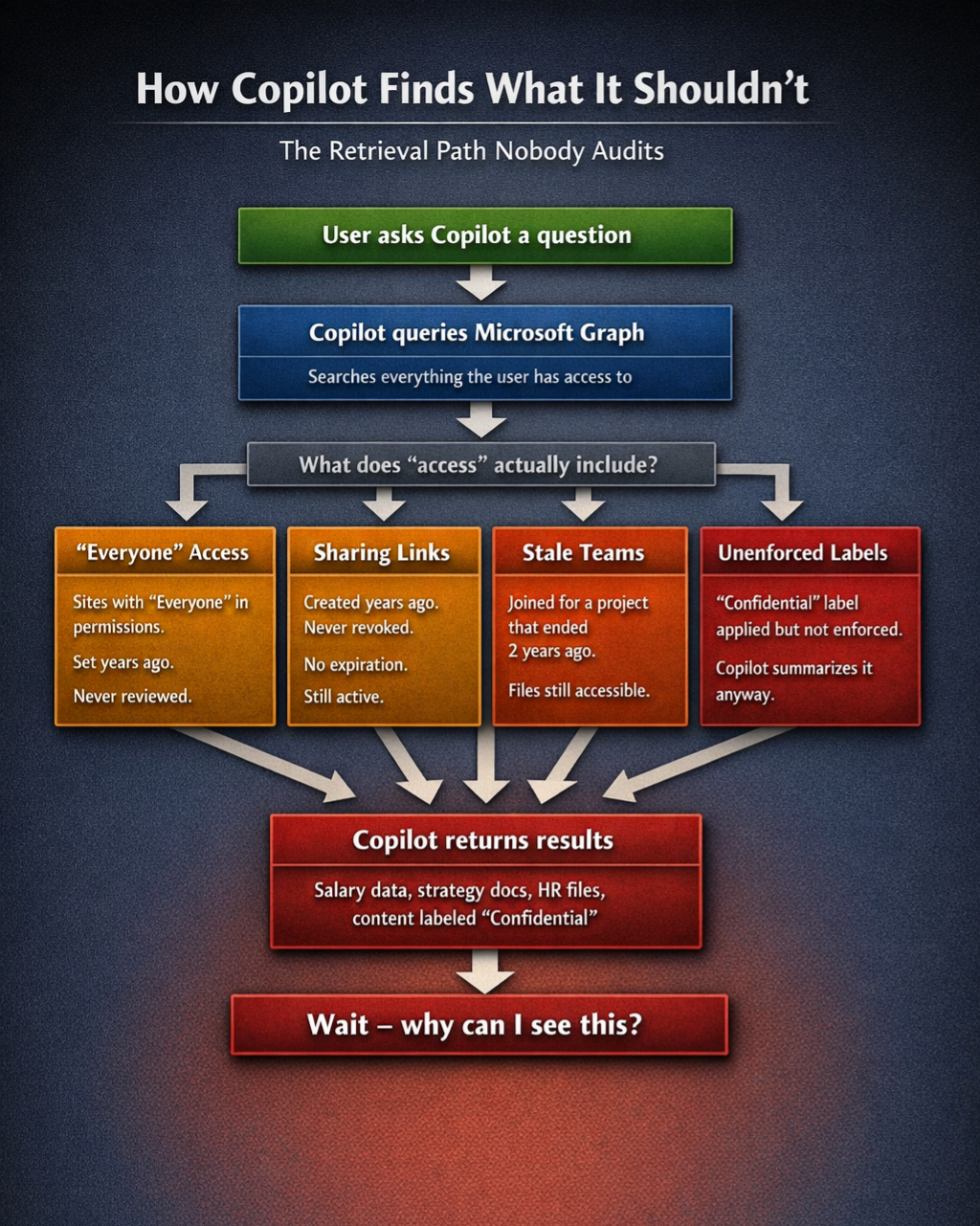 What the demo doesn’t show you is what happens on Day 14 when someone in Finance asks Copilot a routine question and a salary spreadsheet from 2021 surfaces in the response. One with names, base pay, bonuses, and equity. Accessible to 73 people via inherited permissions nobody audited.
